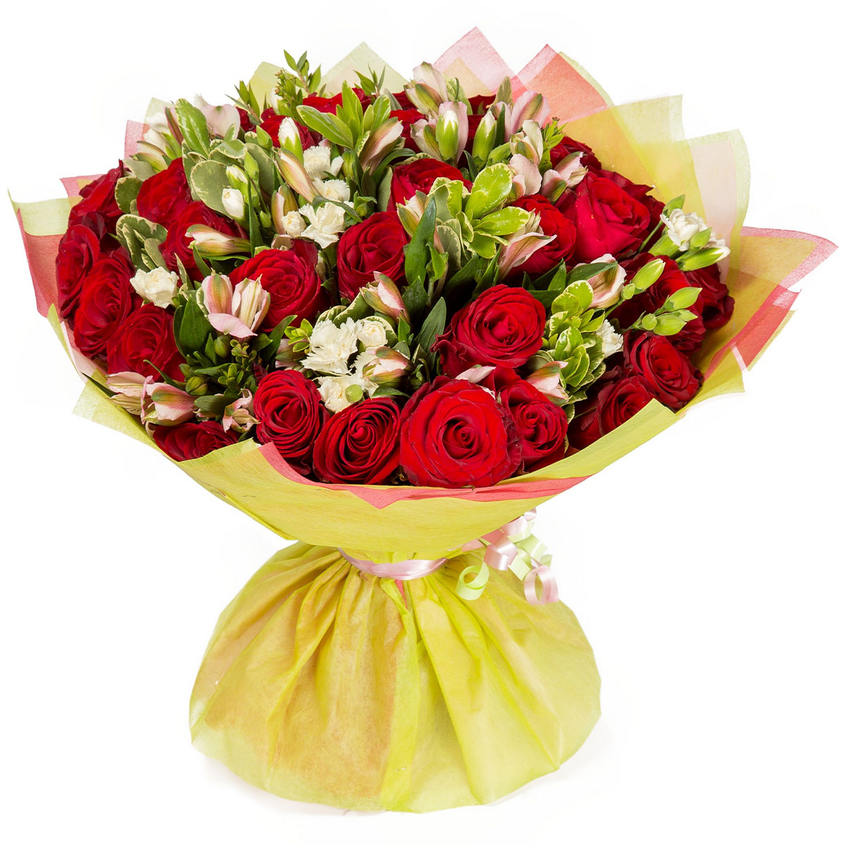 Роза кустовая красная, альстромерия розовая, гвоздика кустовая мини белая, зелень. Упаковка (лента, пленка, крафт, сетка, пленка матовая)