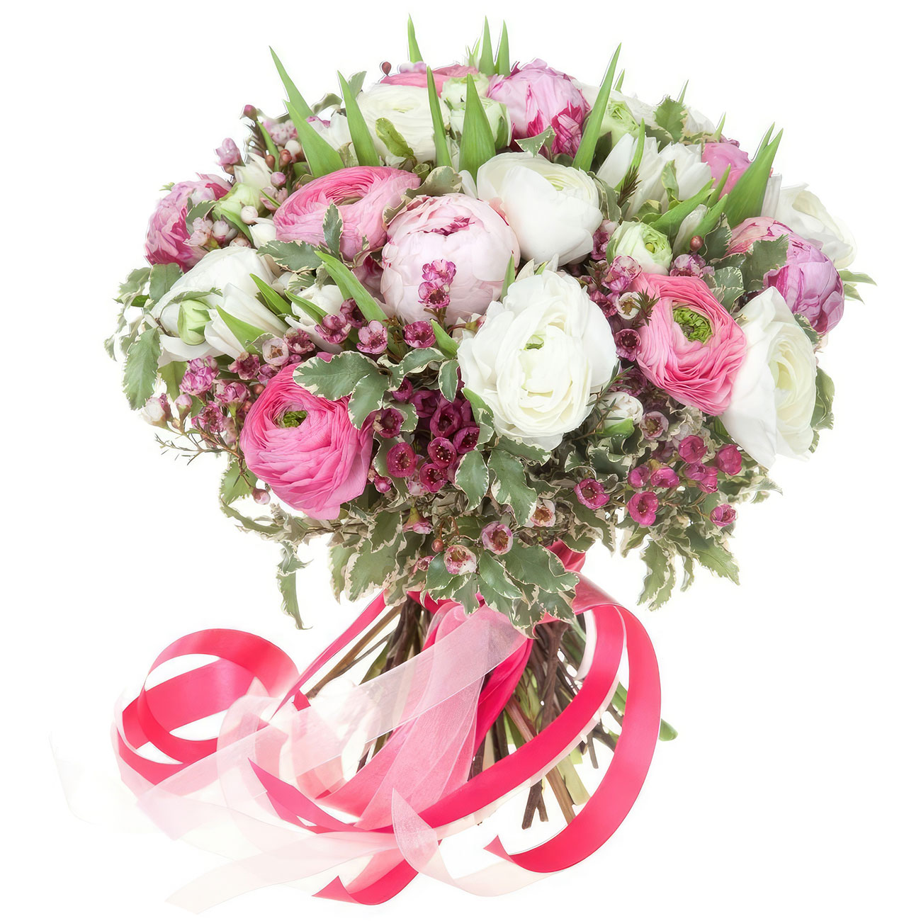 Ваксфлауэр, ранункулюс белый и розовый, пион розовый. Упаковка (лента, пленка, крафт, сетка, пленка матовая)