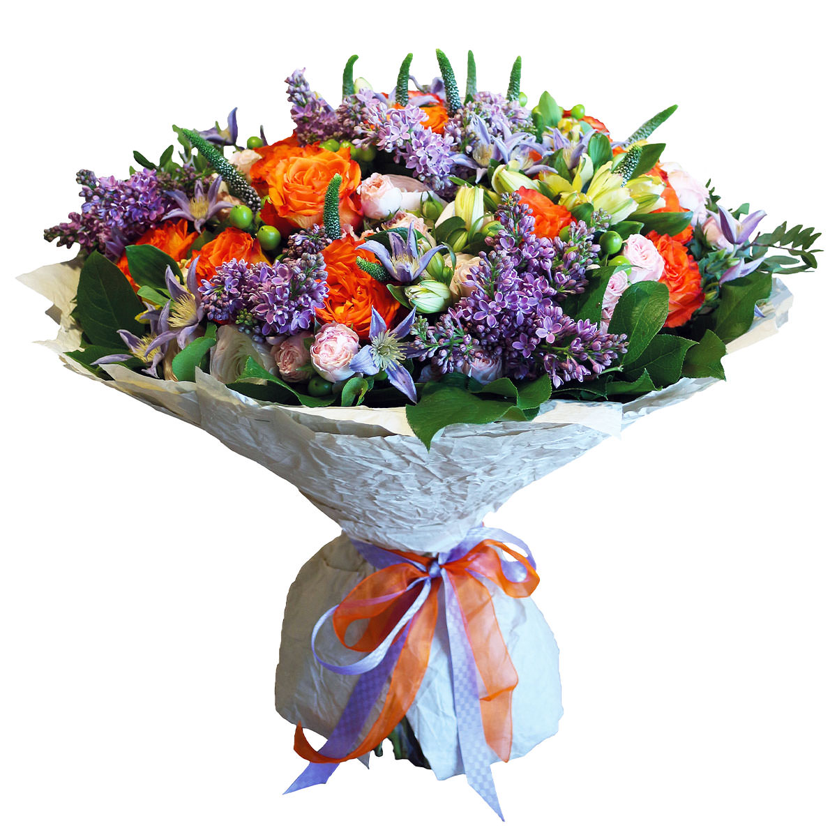 Роза одноголовая оранжевая, роза кустовая розовая, сирень, вероника, клематис, гиперикум. Упаковка (лента, пленка, крафт, сетка, пленка матовая)