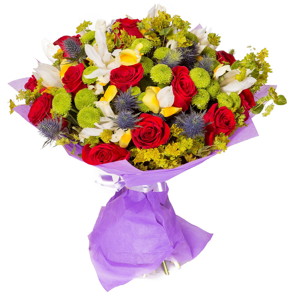 Роза одноголовая красная, хризантема кустовая зеленая, эрингиум, ирис бело-желтый, зелень. Упаковка (лента, пленка, крафт, сетка, пленка матовая)