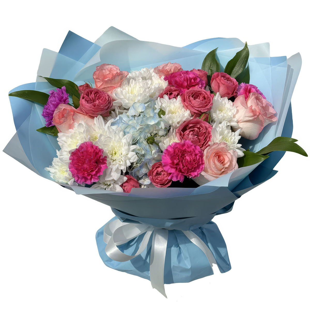 Роза пионовидная розовая, роза одноголовая розовая, гортензия голубая, гвоздика, хризантема белая, аспидистра. Упаковка (лента, пленка, крафт, сетка, пленка матовая)