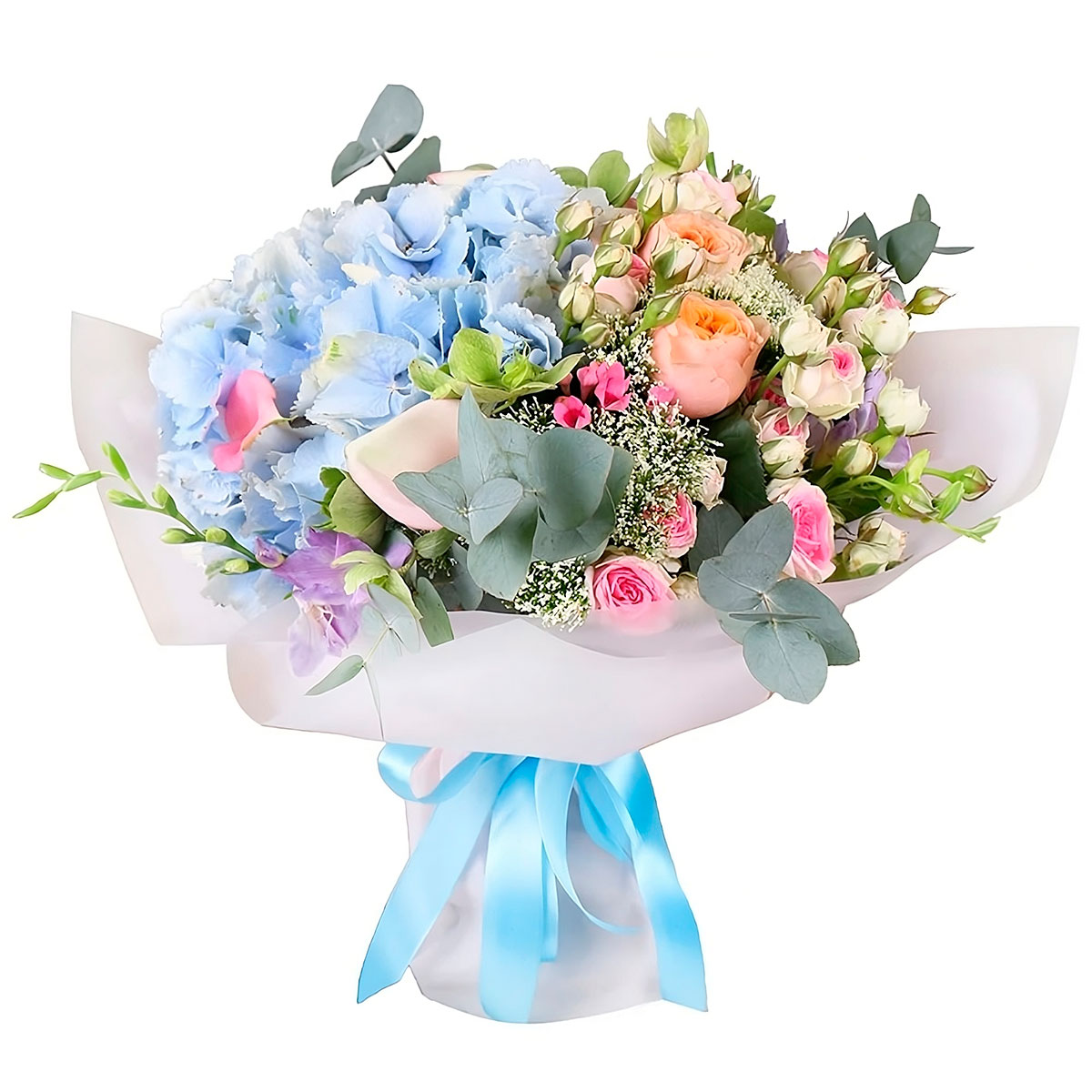 Гортензия голубая, роза пионовидная персиковая, калла нежно-розовая, роза кустовая розовая, эвкалипт. Упаковка (лента, пленка, крафт, сетка, пленка матовая)