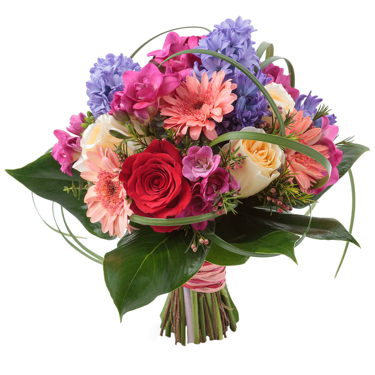 Гиацинт синий, гербера розовая, роза одноголовая кремовая и красная, фрезия розовая, ваксфлауэр, аспидистра, берграс. Упаковка (лента, пленка, крафт, сетка, пленка матовая)