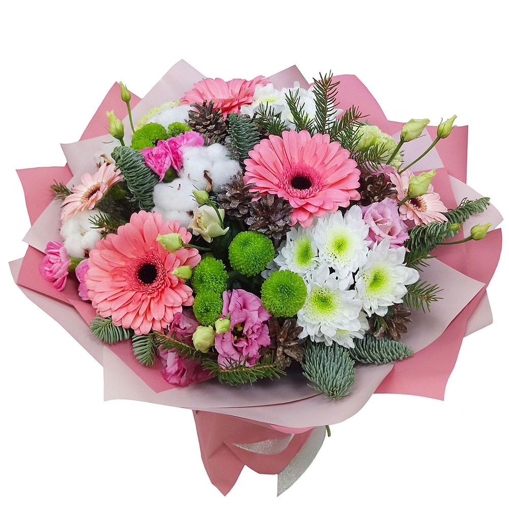 Гербера розовая, хризантема кустовая белая и зеленая, хлопок, эустома белая, зелень, хвойный микс. Упаковка (лента, пленка, крафт, сетка, пленка матовая)