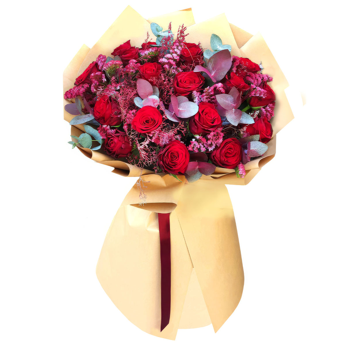 Роза одноголовая красная, статица розовая, эвкалипт. Упаковка (лента, пленка, крафт, сетка, пленка матовая)