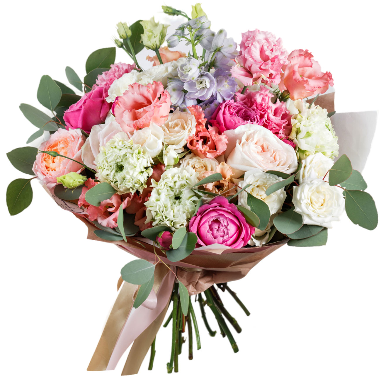Роза пионовидная розовая, персиковая и белая, эустома розовая, эвкалипт. Упаковка (лента, пленка, крафт, сетка, пленка матовая)