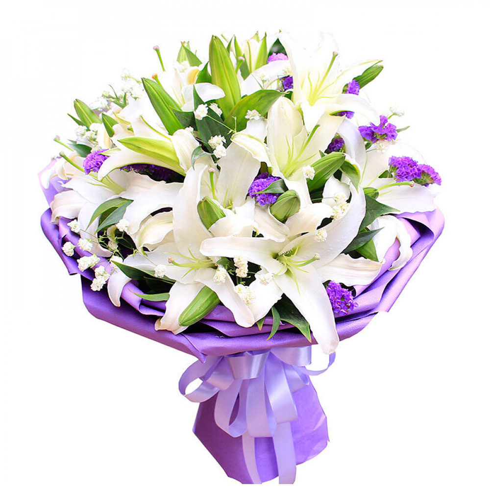 Лилия белая, статица, гипсофила. Упаковка (лента, пленка, крафт, сетка, пленка матовая)