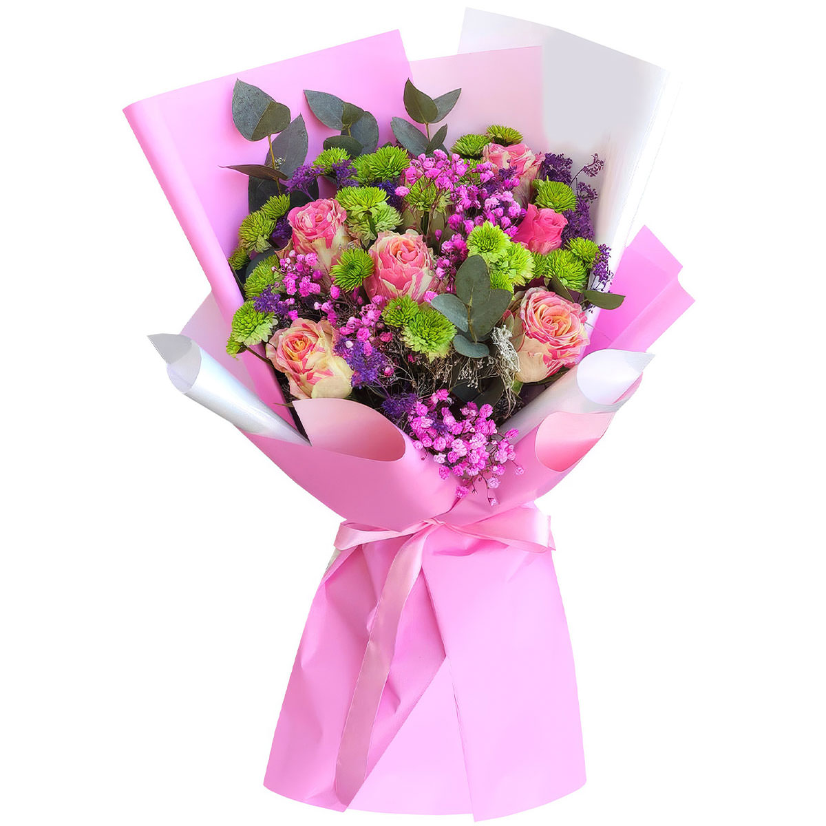 Роза одноголовая розовая, хризантема кустовая зеленая, гипсофила розовая, эвкалипт. Упаковка (лента, пленка, крафт, сетка, пленка матовая)