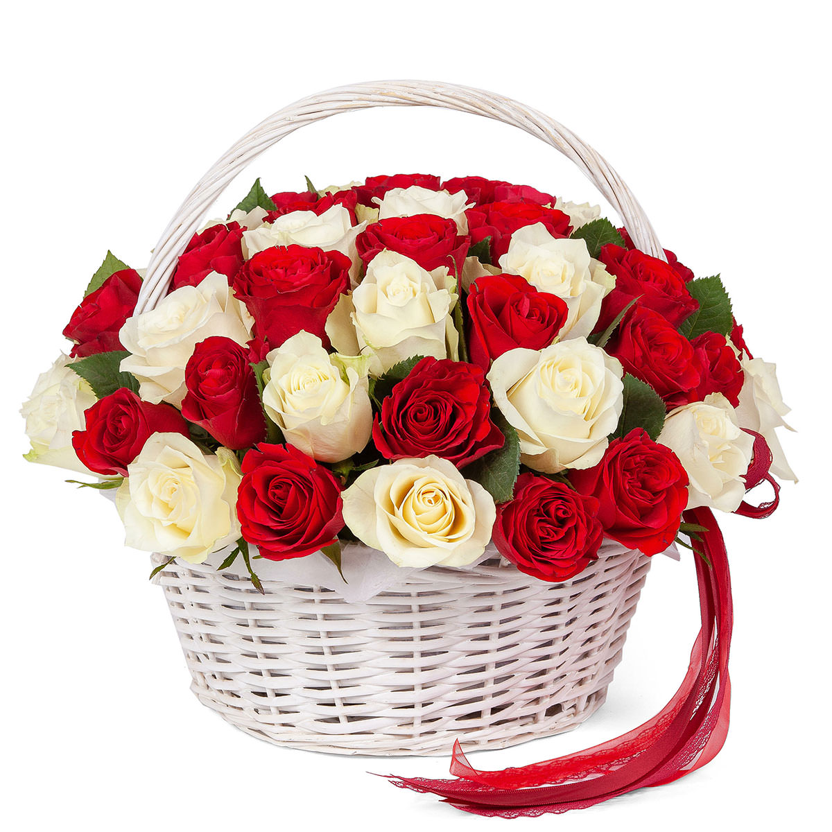 Роза одноголовая красная и белая. Упаковка (Корзина, оазис, ящик).