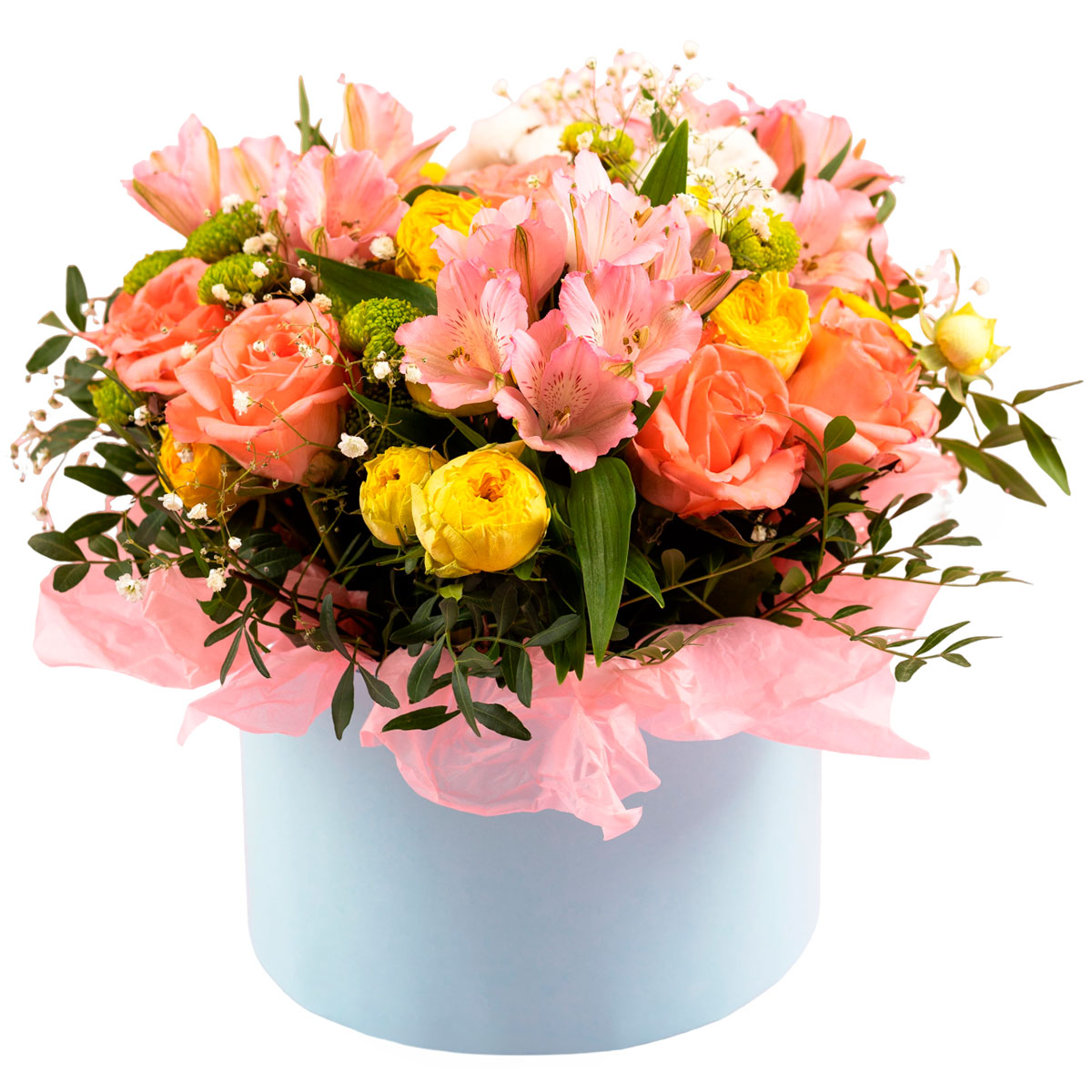 Роза одноголовая оранжевая, роза кустовая пионовидная желтая, альстромерия розовая, хризантема кустовая зеленая, гипсофила, зелень. Упаковка (шляпная коробка, квадратный бокс, коробка сердце, оазис)