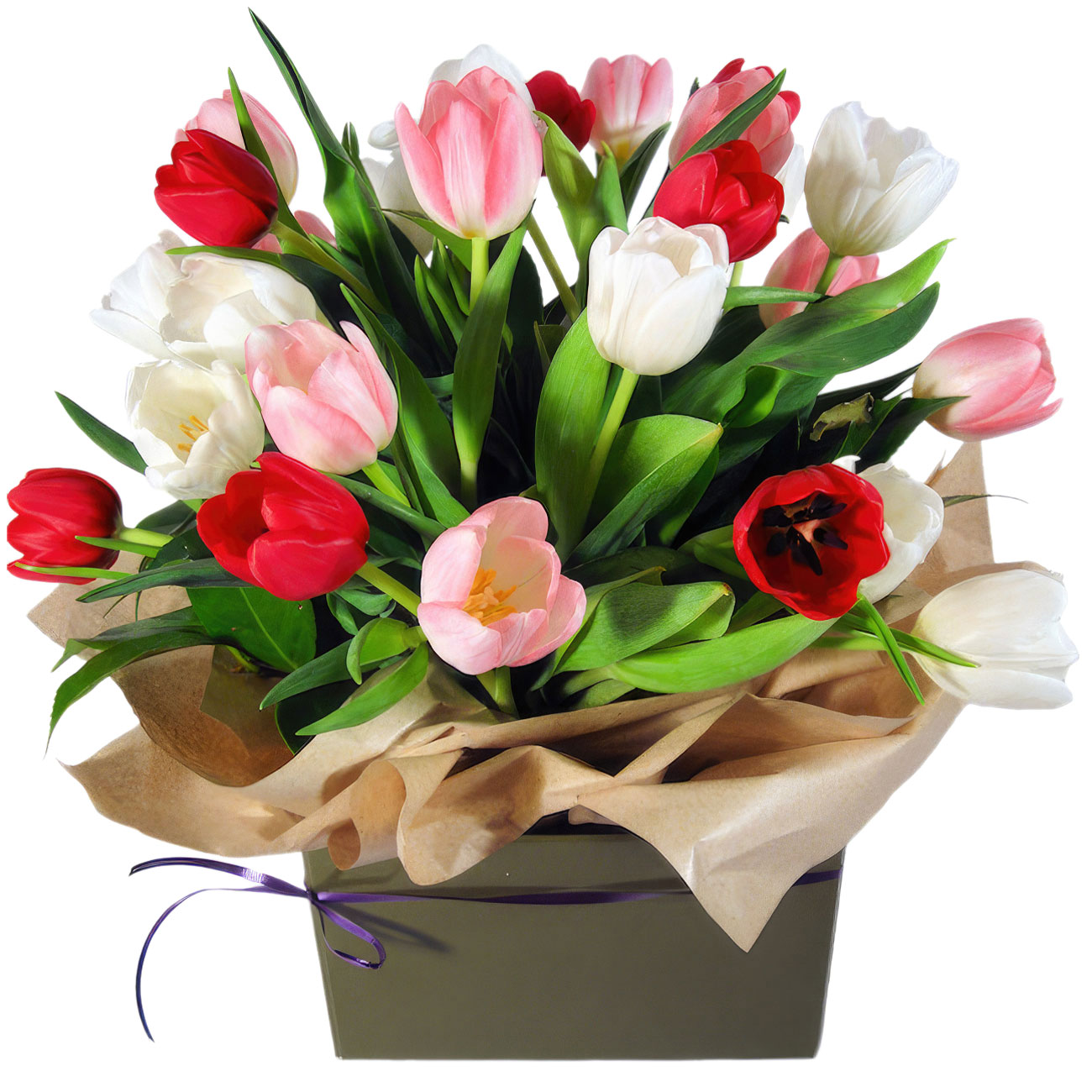 Тюльпан микс (розовый, белый, красный). Упаковка (шляпная коробка, квадратный бокс, коробка сердце, оазис)